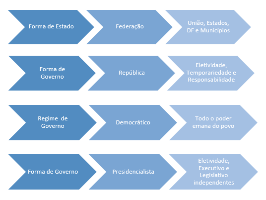 Podemos observar no caput do art. 1°, que a Constituição Federal já estabelece a forma de Estado (Federação) e a forma de Governo (República), além de também enunciar nosso regime político como sendo um Estado Democrático de Direito.